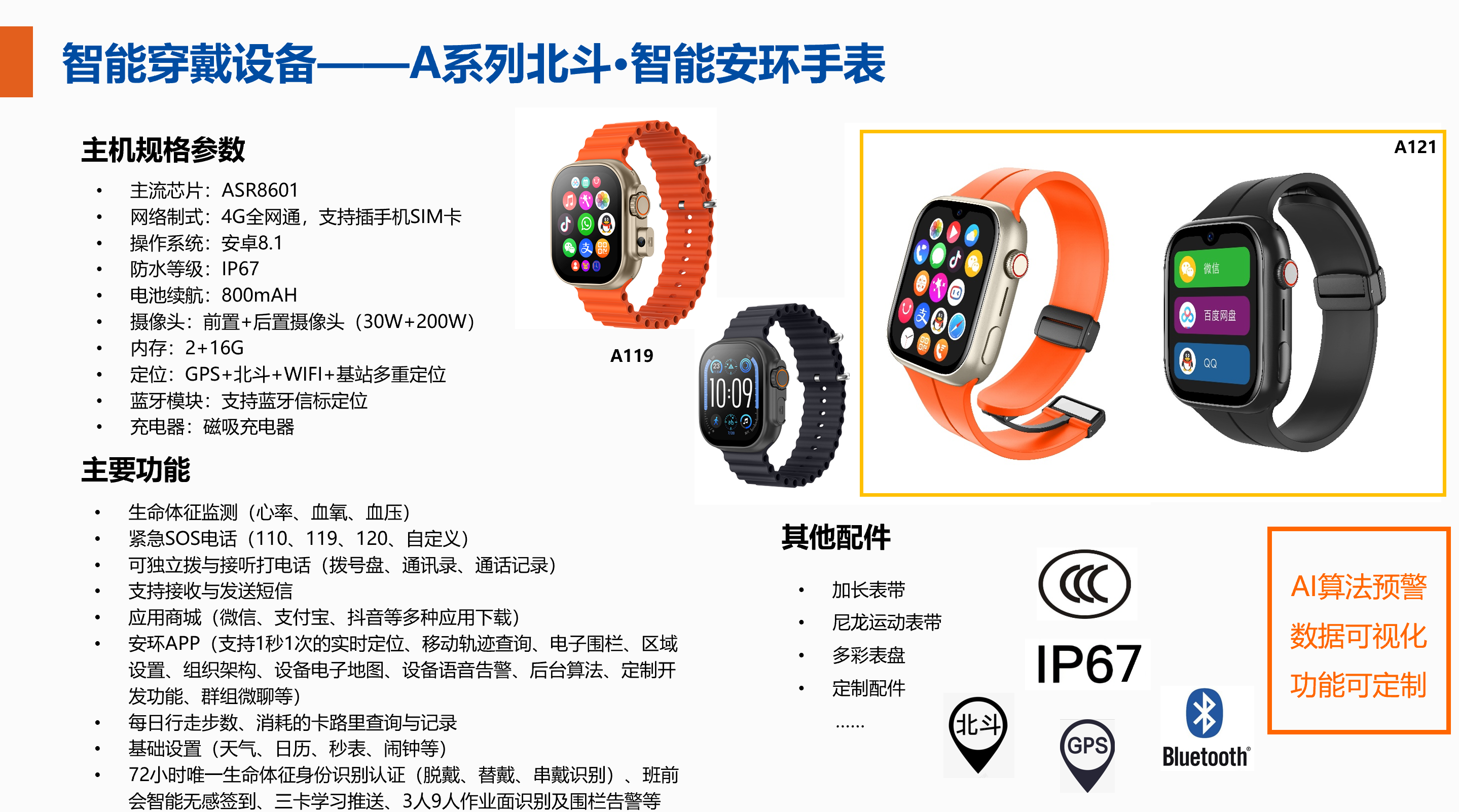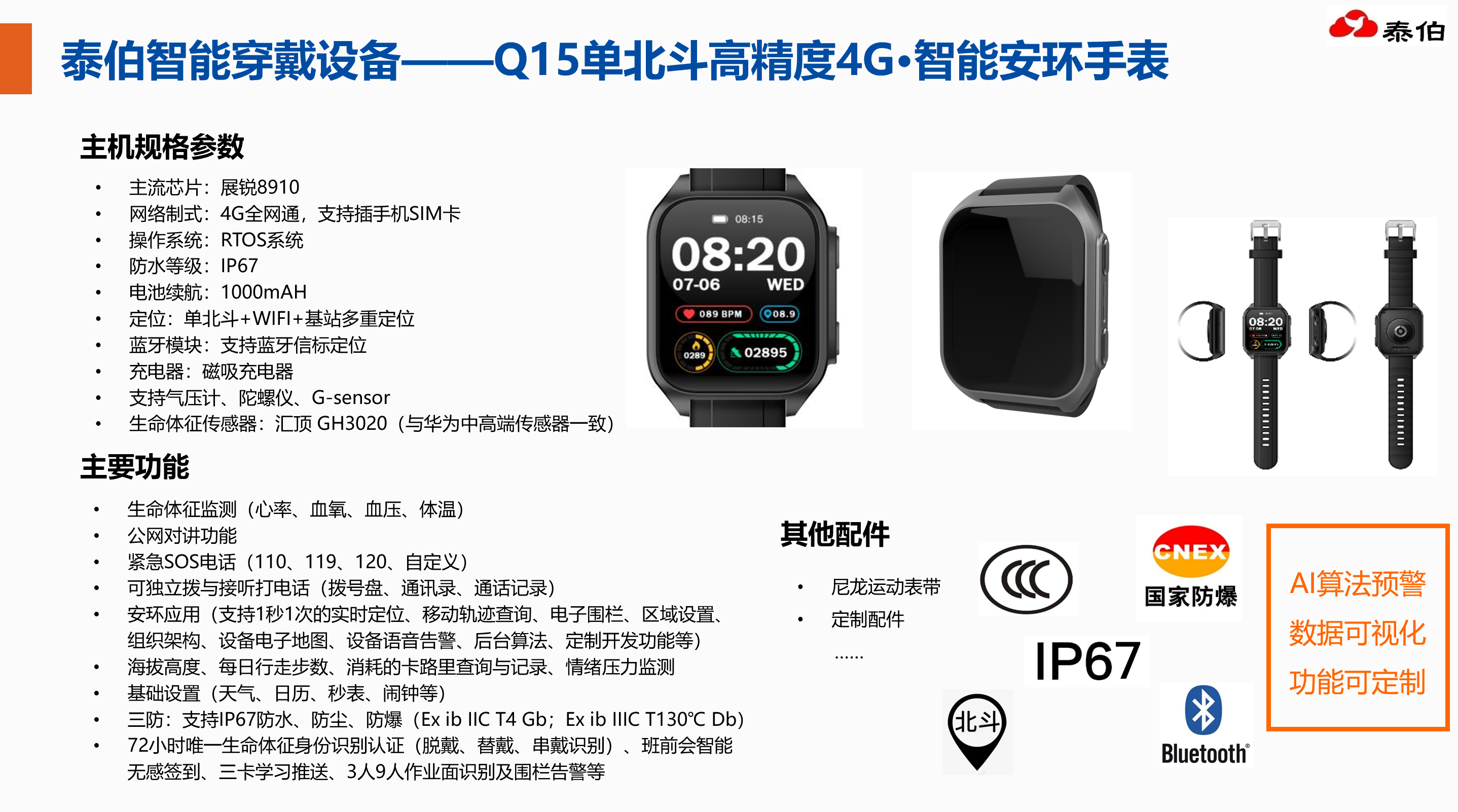 泰伯智能安环手表产品,是一款真正工业级应用的智能手表。支持连续生命体征监测、连续多重定位、可独立拨打与接听电话、一键SOS告警、消息语音推送,轻便灵动,赋能基层安全生产与人员安全守护。
